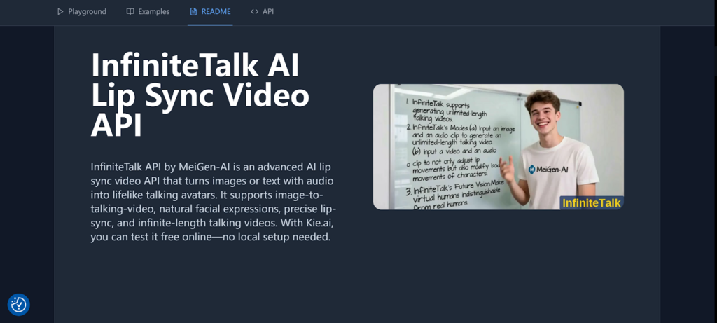 Integrating the Infinite Talk AI API can be complex, requiring stable infrastructure and predictable costs. Kie.ai provides a hosted environment to test and integrate the Infinite Talk talking video generation API without local setup, offering scalable, developer-friendly access.This guide outlines the InfiniteTalk AI API’s key capabilities and provides a clear, step-by-step integration workflow through Kie.ai.
